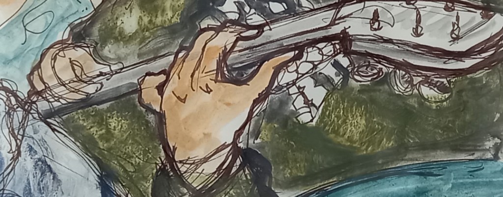 My teenage nephew is staying over, he’s a music student and I wanted to do some sketching with him. I’ve been doing a lot of scribbling at gigs recently but there’s not enough time to really focus on details like hands and the position and the foreshortening of the instruments. As he “noodled” with his guitar on the settee, we chatted about what we were doing and realised we were following more or less the same process, trying out different things with our instruments, messing around to see what would happen, improvising. Living my best life!!!!!!!xxxxx
