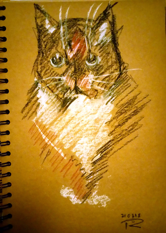 It’s Saturday / Caturday again and here’s another from my cat drawing archives, our youngest, Sparta Puss, aka Sparty Pants, Spartsy and Tyrant. She’s drawn with conte crayons in black, white and sanguine into a brown paper sketchbook.