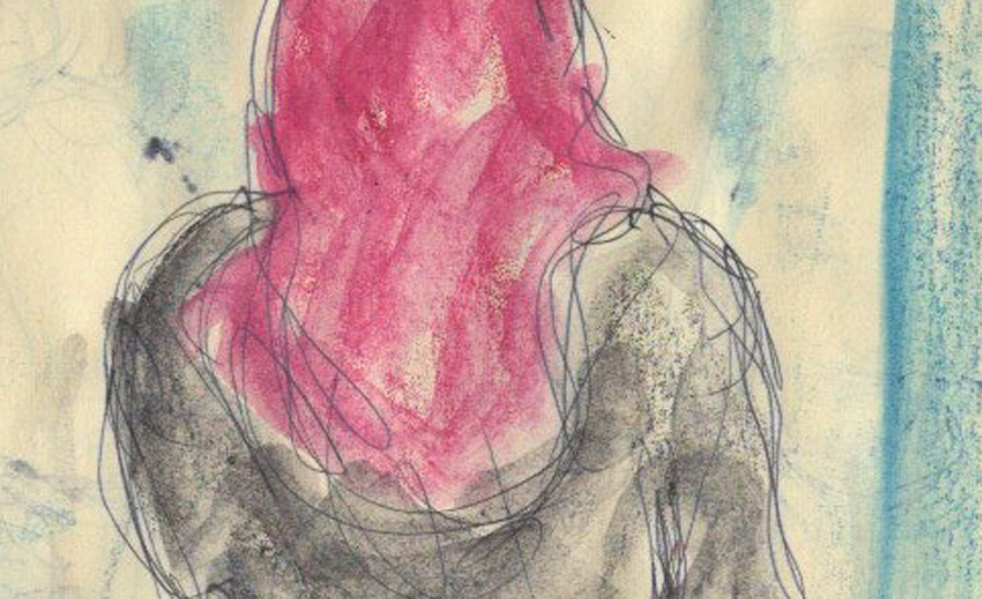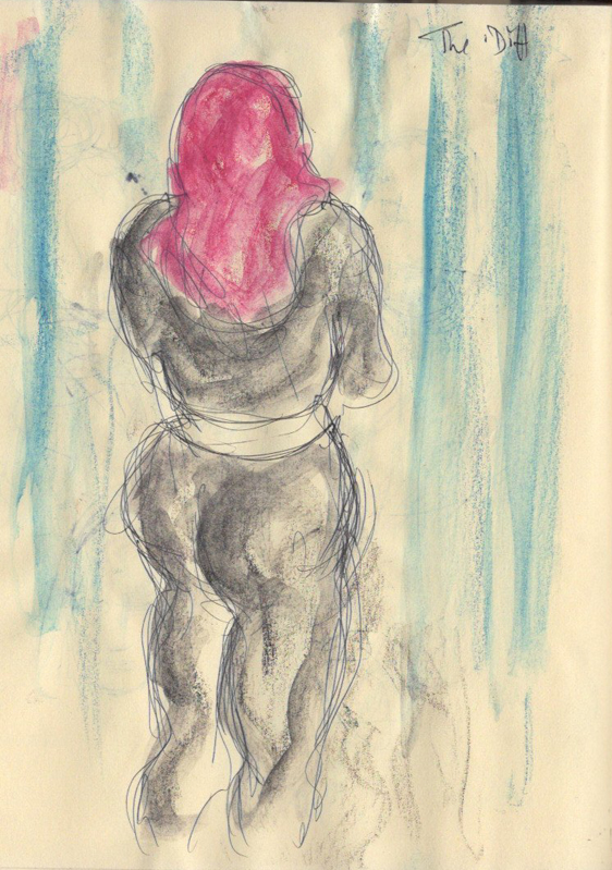 I did quite a few sketches at the rap gig in Cardiff I went to a few weeks ago. It’s challenging working in the dark, I managed to catch a few people in the occasional pool of semi-light. I sketched this dancer with the extraordinary red hair in ballpoint pen and washes of Inktense colour blocks. Drawing in the dark means I take more risks with my work than I would if I was looking at pristine white paper in bright light.