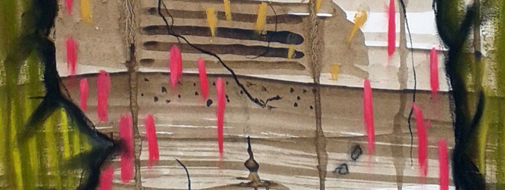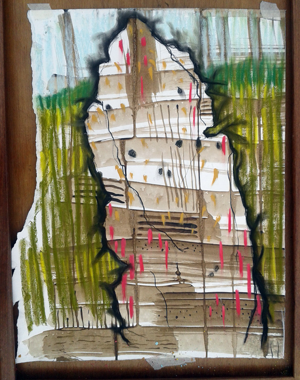 This is a painting / drawing I did a few years ago, travelling across South Wales with Rhondda-born archaeologist Dewi Bowen and Swansea film maker Melvyn Williams, hunting the wild megalith, accompanied by my portable drawing board, portfolio of Fabriano paper and a bag full of assorted artist’s materials. Dewi is researching his latest book on Neolithic monuments and Melvyn is making a documentary film of our literary and artistic adventures. We are following the legendary trail of the boar hunt, y Twrch Trwyth from the Mabinogion, recording the Bronze Age ancestral stones that those ancient hunters might have encountered.