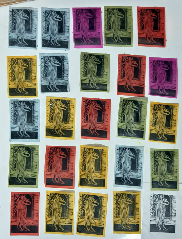 I’ve finished printing a load of little Mari Lwyd linocut prints for Hen Galan cards in mid-January. As far as I know there isn’t an official collective noun for lots of Mari Lwyds, but quite a few people on social media have suggested a Mischief of Maris, to reflect the naughty, sometimes bawdy, nature of the tradition. I’ve printed in black ink onto 5 different colours of hand-made sari and wool papers.
