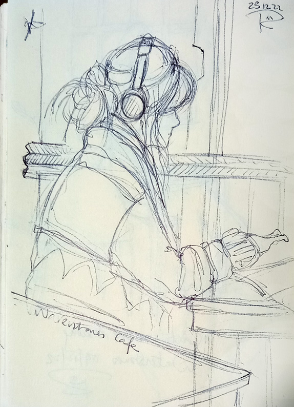 I was hanging out at one of my favourite places today, avoiding the Xmas mayhem in the city centre at the Waterstones Bookshop café, that I missed so much during the Covid lockdowns. I really appreciate being able to drop by now, to chill out and scribble a quiet slice of life. This young woman was engrossed in her technology, I don’t often get the chance to draw headphones in the wild.
