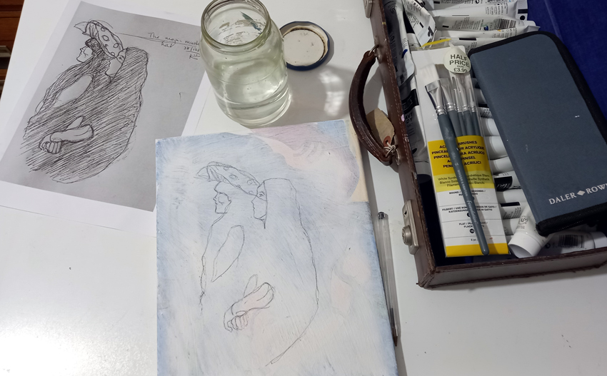 I did a sketch at a fundraising event last week and I like it so much that I’m going to have a bash at making a painting from it. I don’t normally paint from sketches, although I often develop printmaking projects from my sketchbooks, so I’m going to have to approach this in a very different way, I think. I scanned and printed it at size A4 and transferred it to a reclaimed canvas.