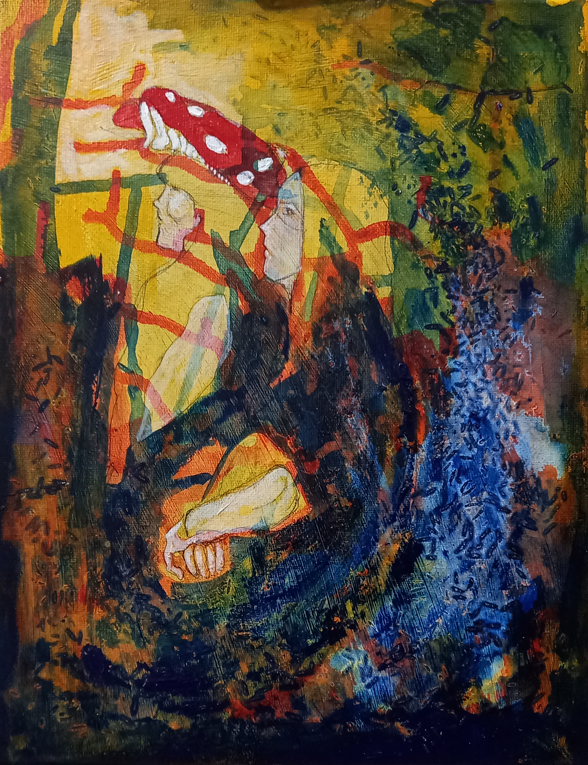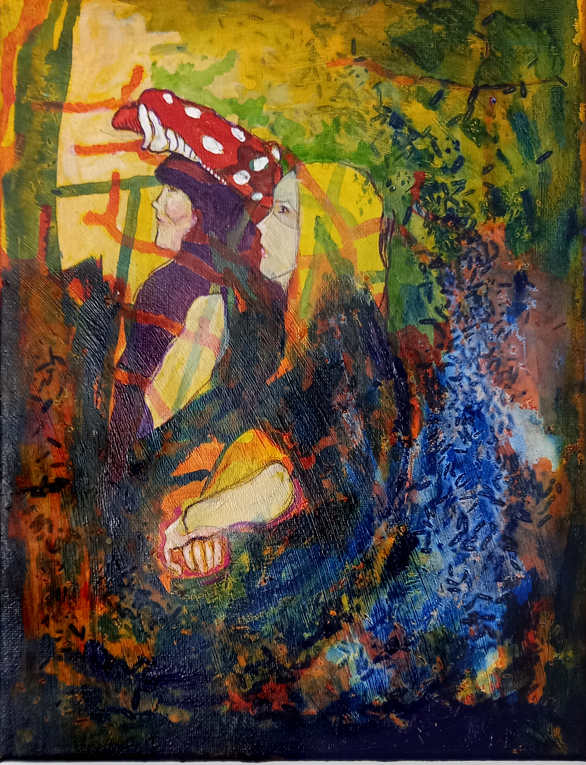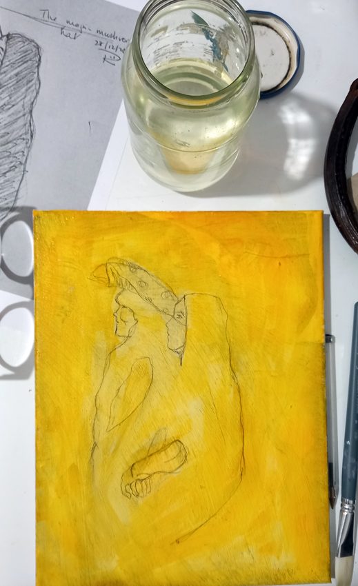 I think this little painting may be just about finished. I’ll sleep on it, but I don’t think I’ll be doing much more, maybe a little softening on the arm. I’ve never done anything like this before, working directly from a sketch and splashing paint randomly in layers, scattering rice into pools of watery pigment, and finally a very small amount of detailing. I used Liquitex Heavy Body acrylics in Indian Yellow, Naphtha Red and Phthalo Blue (red shade) for most of the painting, with some small touches of Dioxazine Purple and Titanium White, which is more of an ecru, at the end.