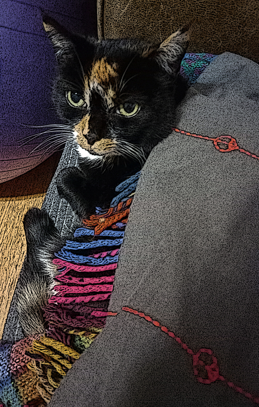 It’s cold, freezing tonight, but this one is snug and warm indoors. Please look out for your pets in this awful weather and keep them in xxx Here’s Sparta Puss, through a Posterise filter in Adobe Photoshop.