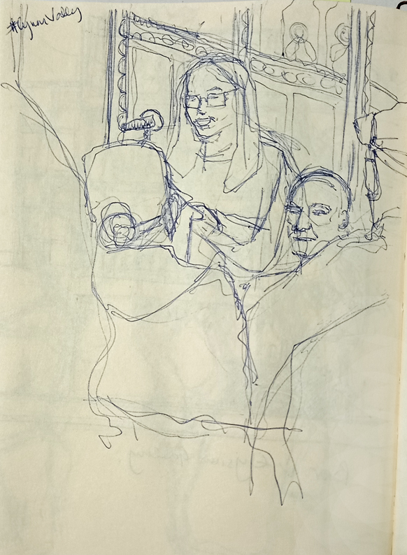 I went up to Aberdare on Saturday to a “Cost of Living” rally where Mick Lynch, General Secretary of the RMT Union was one of the speakers. I did a warm-up sketch to get started, working with the cramped conditions, peeking between tightly-packed shoulders to get a look at the speakers at the front.