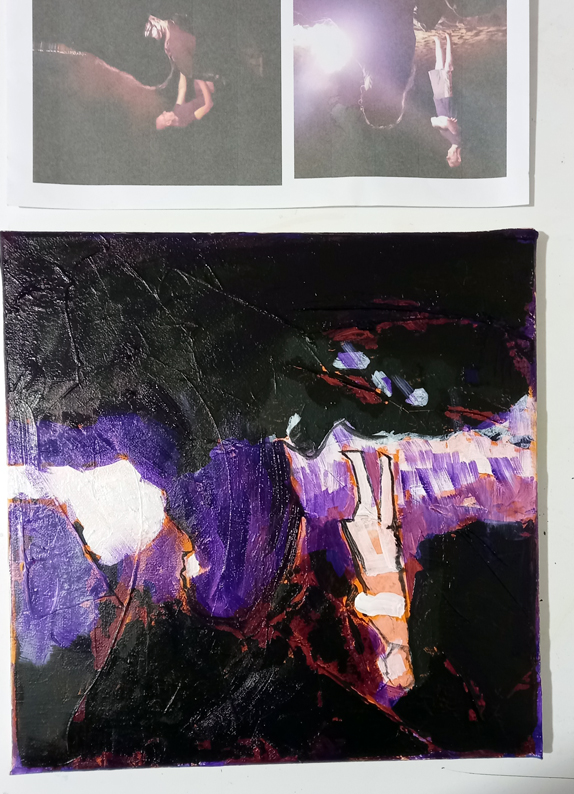 I started this painting a couple of months ago (here), working on top of a recycled canvas. I’m working upside down from a photo as I don’t see the subject clearly any more, just colours, shapes and lines, that I find easier to place accurately. It’s still pretty rough but I can see it starting to take shape.