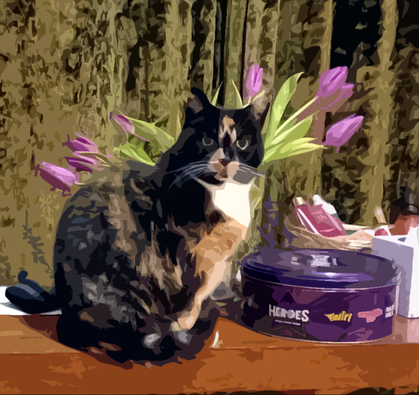 It’s Saturday #Caturday again! Sparta Puss jumped onto the table opposite me the other day and sat in front of a vase of tulips I treated myself to. They’re in that falling-over stage and when she sat down, she was framed beautifully by their purple flowers in front of olive green curtains. A happy accident. I grabbed my phone and snapped a photo. Then I had a play in Adobe Photoshop, the cutout filter. I like Photoshop, it’s fun.