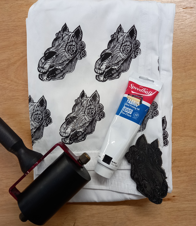 I spent the afternoon down at Swansea Print Workshop today, doing some fabric printing. It’s rare for me – I’m a paper fiend – but this is for something very specific. I’m printing onto some items of clothing with one of my little Mari Lwyd linocuts.