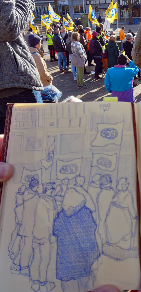 I am a lifelong union member, for over four decades, and I went to a demonstration in Castle Square in Swansea in support of those on strike today. Of course, I had to have a scribble. Here’s some of the members from the Public and Commercial Services Union, grouped around their flags.