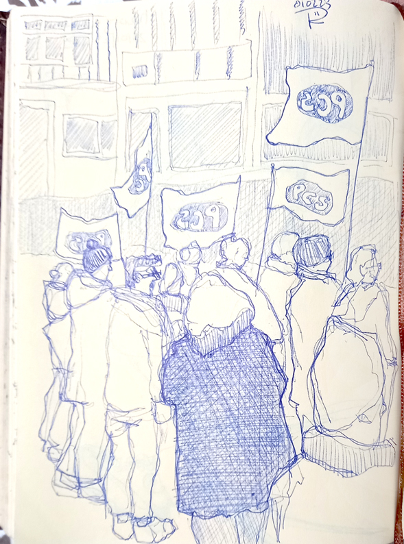 I am a lifelong union member, for over four decades, and I went to a demonstration in Castle Square in Swansea in support of those on strike today. Of course, I had to have a scribble. Here’s some of the members from the Public and Commercial Services Union, grouped around their flags.