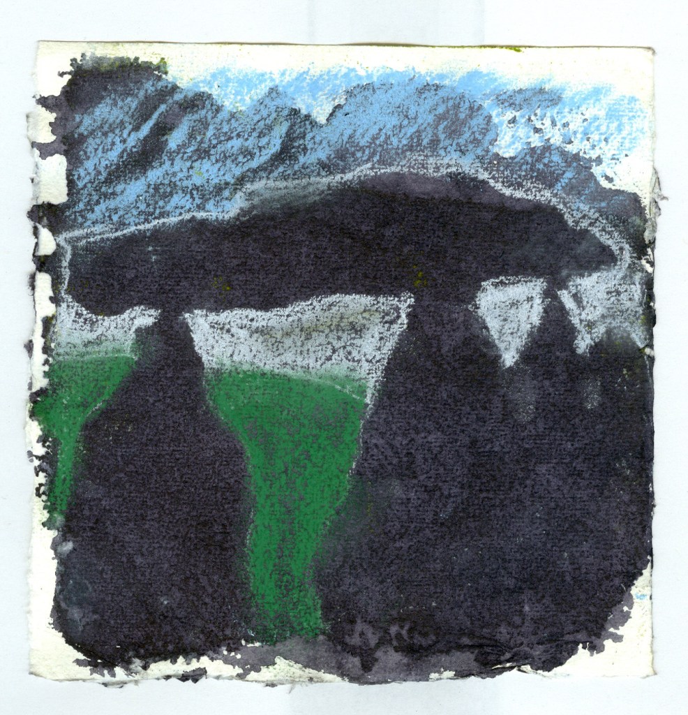 It’s #StandingStoneSunday on t’Internet today and here’s a view of the magnificent monument Pentre Ifan in Pembrokeshire. I drew it in ink and soft pastels onto a rough Khadi handmade paper. You can read more about my field trip here.
