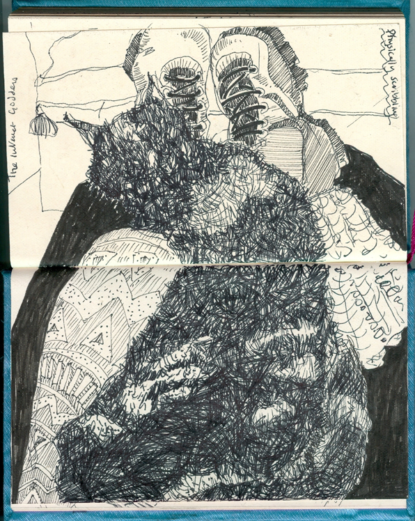 It’s #Caturday Saturday once again and here’s a drawing from ages ago when I was still using Faber Castell Pitt drawing pens. I don’t really know why I stopped, I generally use ballpoint pen now in my sketchbooks. I was chilling one evening with Sparta Puss stretched out on my lap, wearing some snazzy leggings and walking boots (me, not the cat). I liked the composition before me, so I had a scribble.
