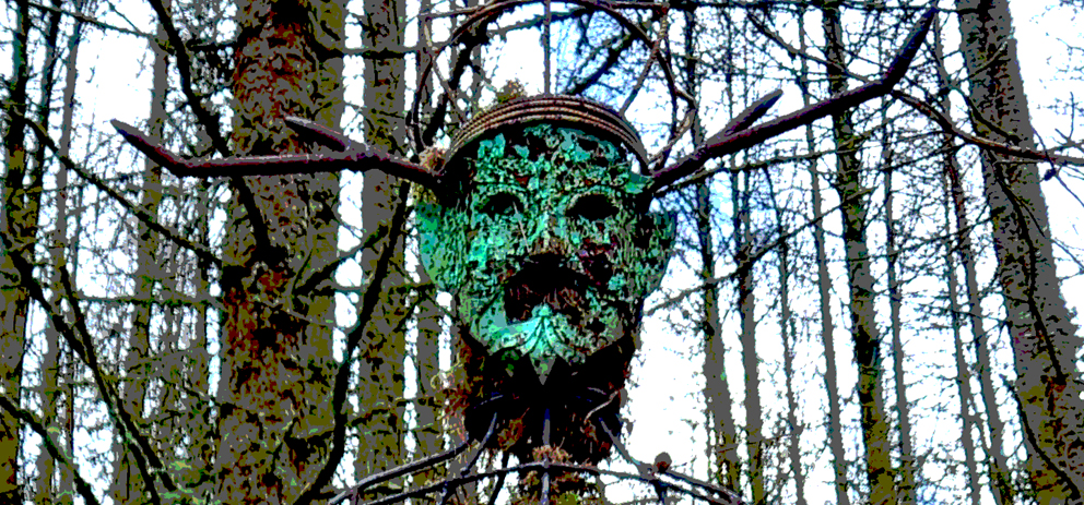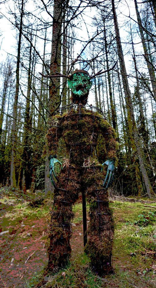 Husb and I have had two very outdoors days, loads of exercise – I’m aching. Yesterday we went walking up Kilvey Hill and came across this Green Man in the forest. I’ve tweaked him in Adobe Photoshop “Posterise” filter. When I was a kid, Kilvey Hill was black and barren, ruined from 200 or so years of heavy industry, but now it is a beautiful, lush forest. Nature has reclaimed it.