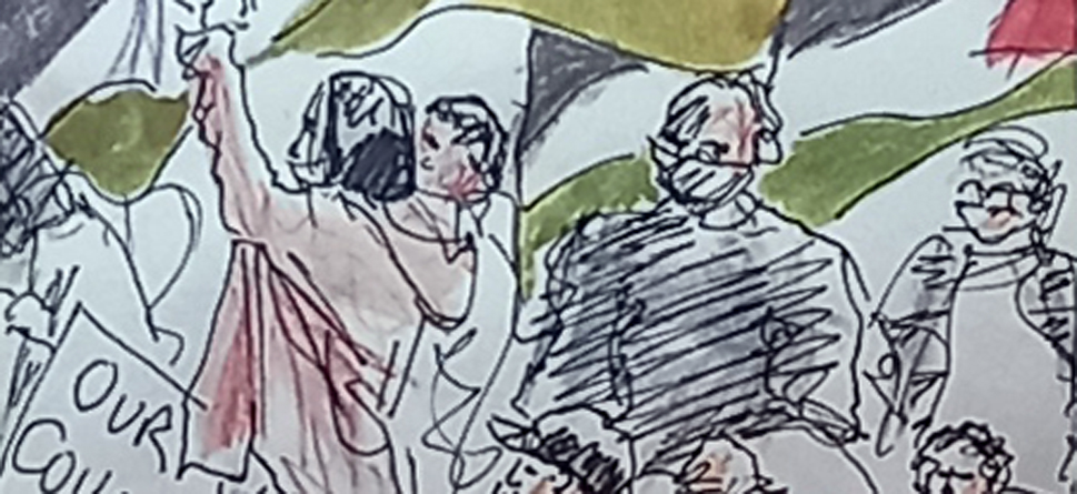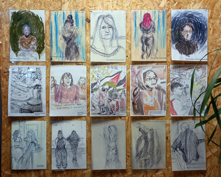 We were locked out of the bogs during Covid19 and life has sort of got in the way a bit too, but now we’re back on track and we’ve just put up our first post-Covid BogArt in time for International Women’s Day. It’s a collection of drawings featuring women from our sketchbooks: women dancing; women demonstrating; women performing; women listening; women chatting. Pop in for a coffee and cake, or check out their events, and visit our exhibitions in the bogs.
