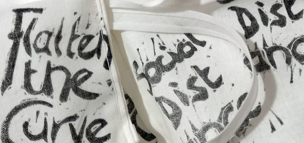 I’m finally getting to grips with the lino blocks of text I started back at the beginning of lockdown 2020. I’m making mask shapes out of cotton and printing them with the words and phrases I carved into lino, reflecting my feelings and observations over the period. But these are not masks. They are NOT PPE. They are artworks and they will be exhibited in “Pitchfork” at The Workers Gallery in Ynyshir from April 7th.