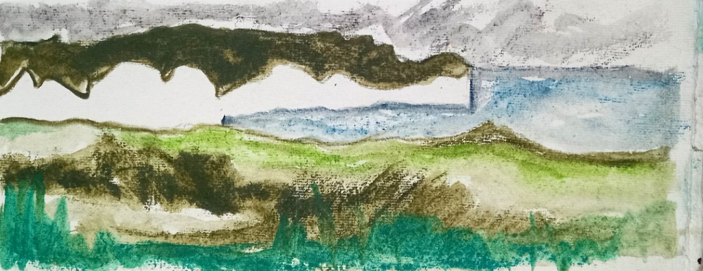Husb and I spent a few days with friends on the South East coast of England last week. It was cold and very windy but mostly sunny too, great walking weather and great walking country. We strolled over the South Downs with the Seven Sisters in the distance. Of course, I had to have a scribble, but it wasn’t easy in a high wind! So I kept it very quick, making a few marks with my Inktense blocks and using my reservoir brush to turn the dry medium into an ink wash.