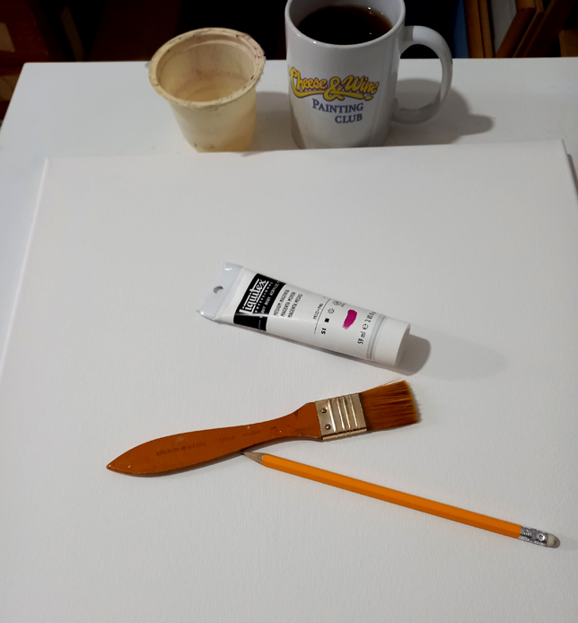 I’m starting a new painting so the first thing to do is to prepare it by getting rid of the intimidating white that’s on a fresh new canvas. During the Covid19 lockdown, which went on for nearly 2 years, I took up painting after a break of about 4 decades – I hadn’t painted since art college. I joined Ed Sumner‘s “Cheese and Wine Paint Club” on Facebook and followed along weekly as Ed taught lots of Lockdowners how to paint by “faking” famous paintings. It was fun, it was instructive and it created a lovely community of people united in art.