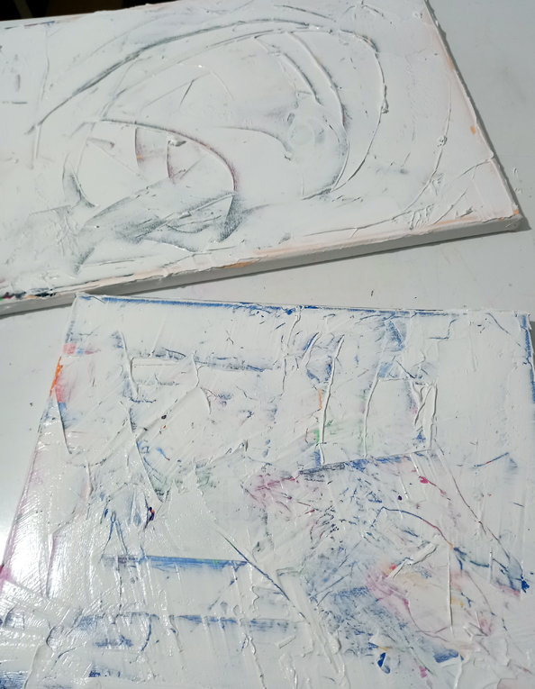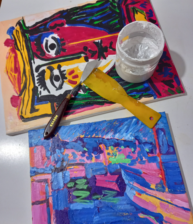 I opened up a tub of acrylic gesso, grabbed some palette knives and covered a couple of used canvases with a thick textured layer. The paintings were done a while back with Ed Sumner’s Cheese and Wine Painting Club on Facebook during the pandemic lockdown. They were fun to do and I learned a lot but I can’t see any point in keeping them.