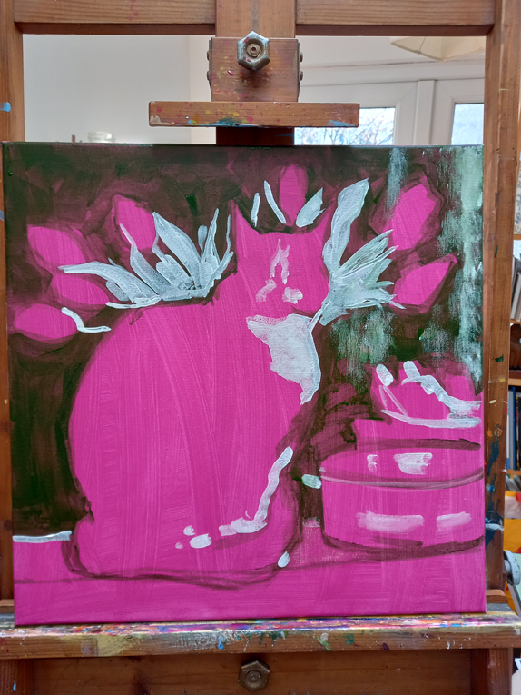 I blocked in a rough outline with a translucent Hooker’s Green (left), then added highlights in opaque Titanium White (centre), and used a rag to apply a textured opaque Titanium White directly onto the still damp Hooker’s Green in the background and some texture into the cat’s coat. Plenty more to do though. I’m using Liquitex Heavy Body acrylic paint onto a stretched canvas.
