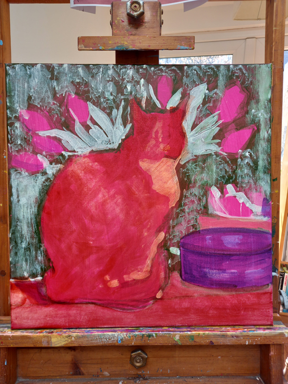 I carried on with the painting of Sparta Puss, adding some more layers of translucent Liquitex Heavy Body acrylics. I played with the brushstrokes on the cat’s fur, using paint straight from the tube on a dry brush and making them choppy to look more furry.