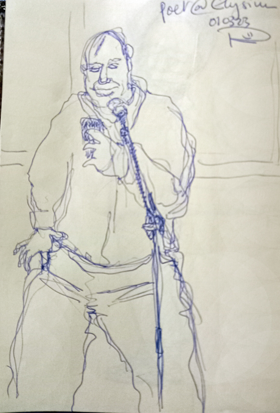 Here’s a quick sketch I made a few weeks ago at a poetry gig at the Elysium Gallery and Bar. He was very lively, great fun and I managed to keep up with him as I scribbled.