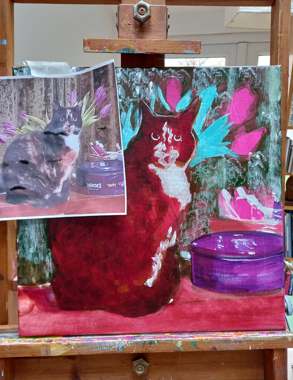 A bit more work on my painting of Sparta Puss with tulips today, doing the white areas and starting on the facial features, which I did freehand with a small brush and white paint. It’s not a bad likeness, her eyes are a bit close together but that’s easily corrected. I began the details on the chocolate tin as well. This picture is as much a still-life as a portrait of the cat.