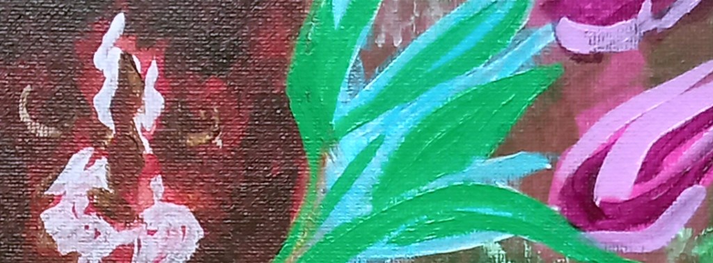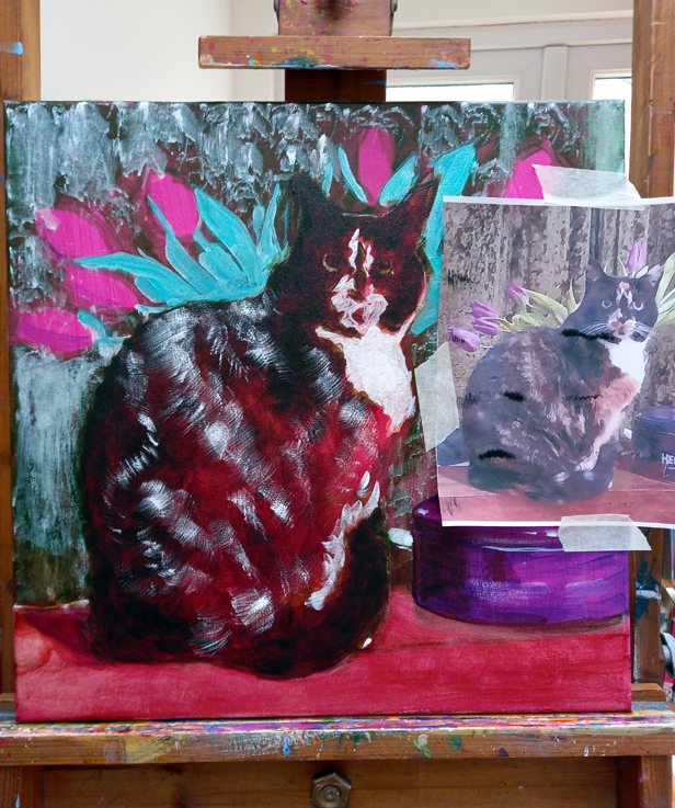 Using Liquitex Heavy Body acrylics and a fan brush I highlighted the areas of lighter tones on her fur in Titanium White (left); with a flat brush I painted details on the tulip leaves and added colour to the curtains in Light Green Permanent (centre); and Quinacridone Blue Violet and Titanium White to do some detailing on the tulips and the chocolate tin.