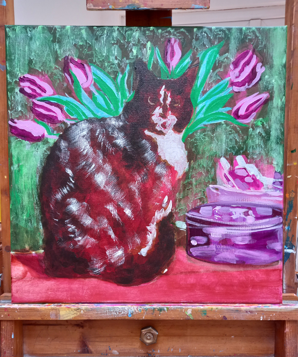 Using Liquitex Heavy Body acrylics and a fan brush I highlighted the areas of lighter tones on her fur in Titanium White (left); with a flat brush I painted details on the tulip leaves and added colour to the curtains in Light Green Permanent (centre); and Quinacridone Blue Violet and Titanium White to do some detailing on the tulips and the chocolate tin.