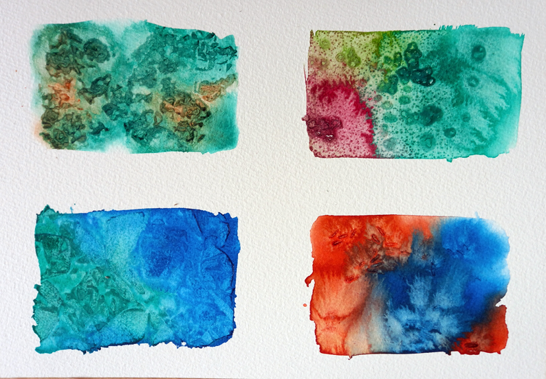 Today was a fun day. Last week’s adult education group prepared some samples of different watercolour effects but they were still wet when they left (below), so today we had the big reveal! It’s always exciting and these techniques often have that WOW factor!