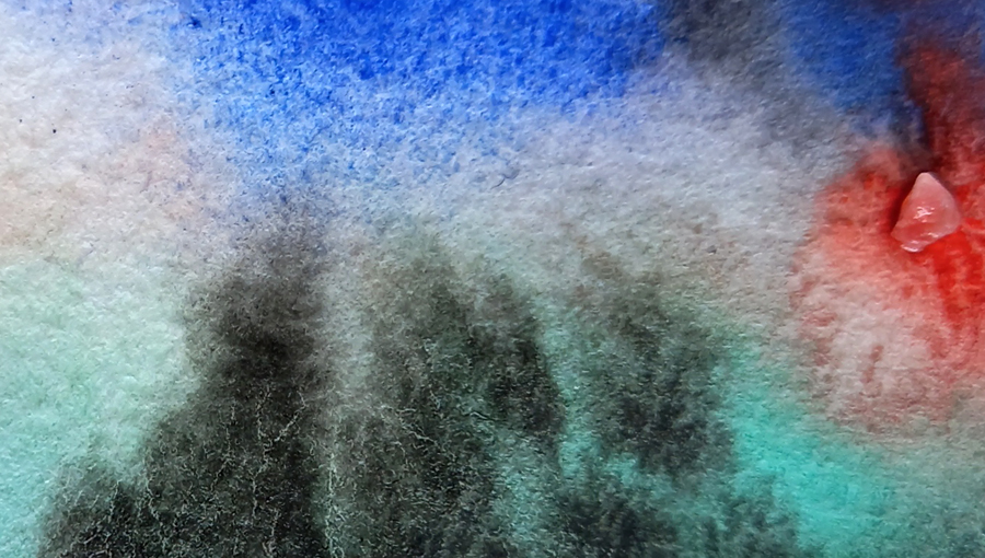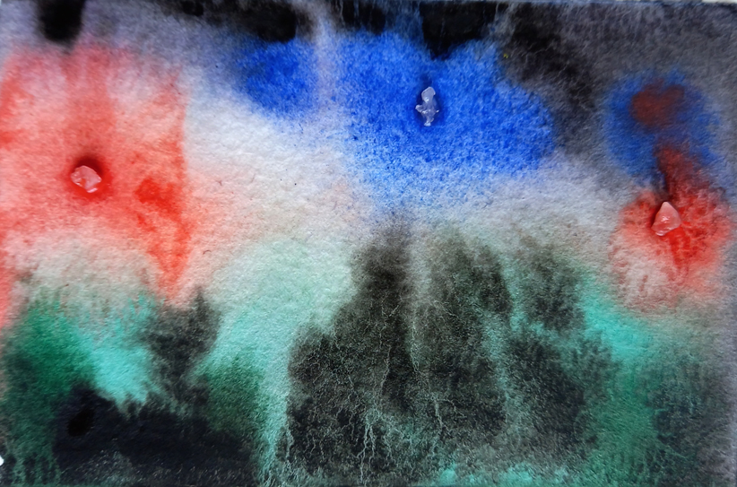 Here’s another little watercolour from my adult teaching session this week. I’ve been emphasising that the important thing about watercolours is actually the water, letting the image develop as it dries. We flooded the stretched Bockingford paper with clean water then using a very wet brush, “dropped” the wet pigment onto the paper without overworking it. I dropped three grains of sea salt onto this one to concentrate the pigment around them.