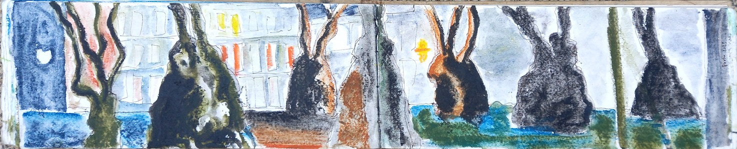 I was so taken with the odd pollards in the Porto park, Jardim da Cordoaria, that I went back the next evening with my landscape Khadi sketchbook and Derwent Inktense blocks and spent a while drawing the strange trees in a mix of natural night-time darkness and harsh orange/yellow street lighting.