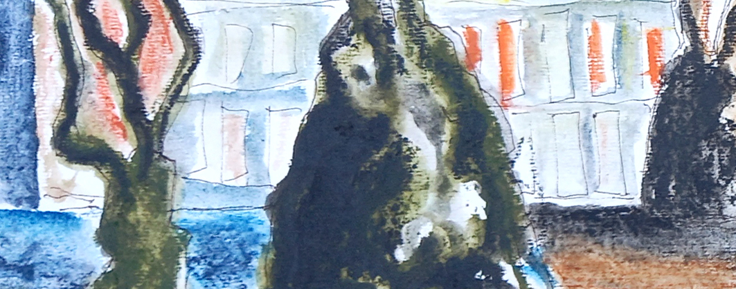 A drawing of heavily pollarded trees in a park in Porto, Portugal. There are 7 trees, mostly dark against a mid-grey background.