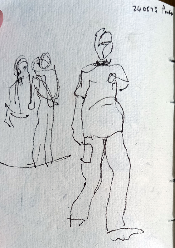 I sometimes stand on the pavement and scribble people walking along. Most people move quite quickly so my sketches are speedy. I generally spot someone when they’re quite a way down the road and follow them as they get closer, focusing on the essence of the figure, not the details. I did a few of these when Husb and I were in Porto last week.