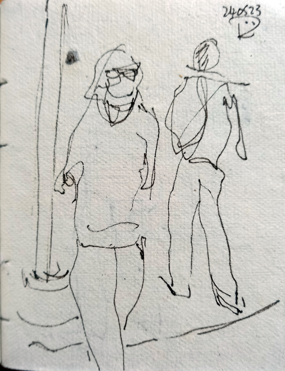 Some more of the very quick sketches I did last week on holiday. I like to stand on the pavement and speedily scribble people walking along, most people move quite fast. I prefer to follow someone from when they’re quite a way down the road.