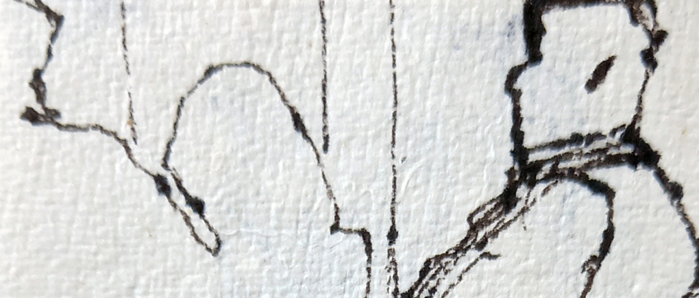 I was at a conference over last weekend. It was a good one, not one of the boring, meaningless jollies I remember from my younger working days. I guess people don’t have time to waste now, or demand better value for money. But I found a few minutes here and there to have a quick scribble into my teeny leather-bound sketchbook with a Faber Castell Pitt drawing pen (Sepia size S).