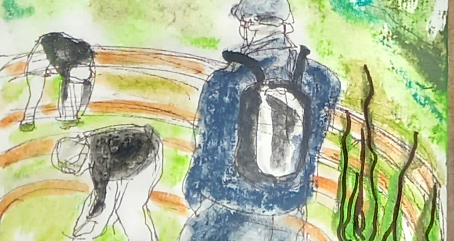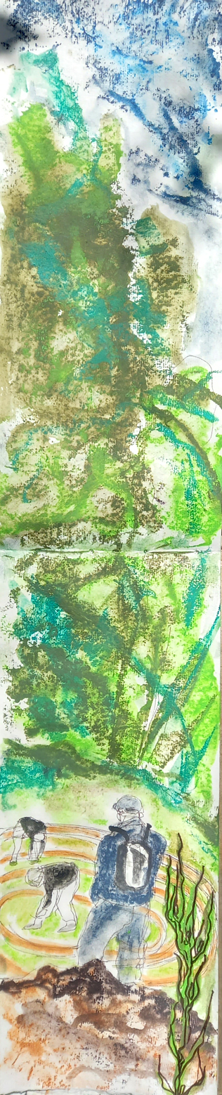 I strolled up the hill today and found a good point to have a scribble. I did a few quick preliminary sketches into a tiny sketchbook and then worked up this larger one into my Khadi landscape book, using Faber Castell Pitt drawing pens sizes S and M, and Derwent Inktense watercolour blocks.