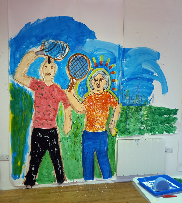 I did some teaching this week, with a group of adults at GS Artists in Swansea as part of their excellent 9to90 Community Arts programme. We did BIG acrylic paintings with life size figures and a tennis theme for Summer. And it was MESSY! Loved it! I started out by getting people to draw around each others bodies to get outlines in place and then we went at it with runny colours, sponges, bath scrunchies and even the occasional paintbrush which we used for splattering!