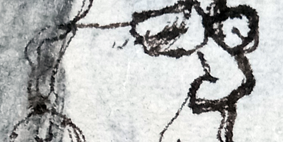 I drew with a Faber Castell Pitt drawing pen and a stick of Nitram charcoal into a small leather-bound sketchbook.