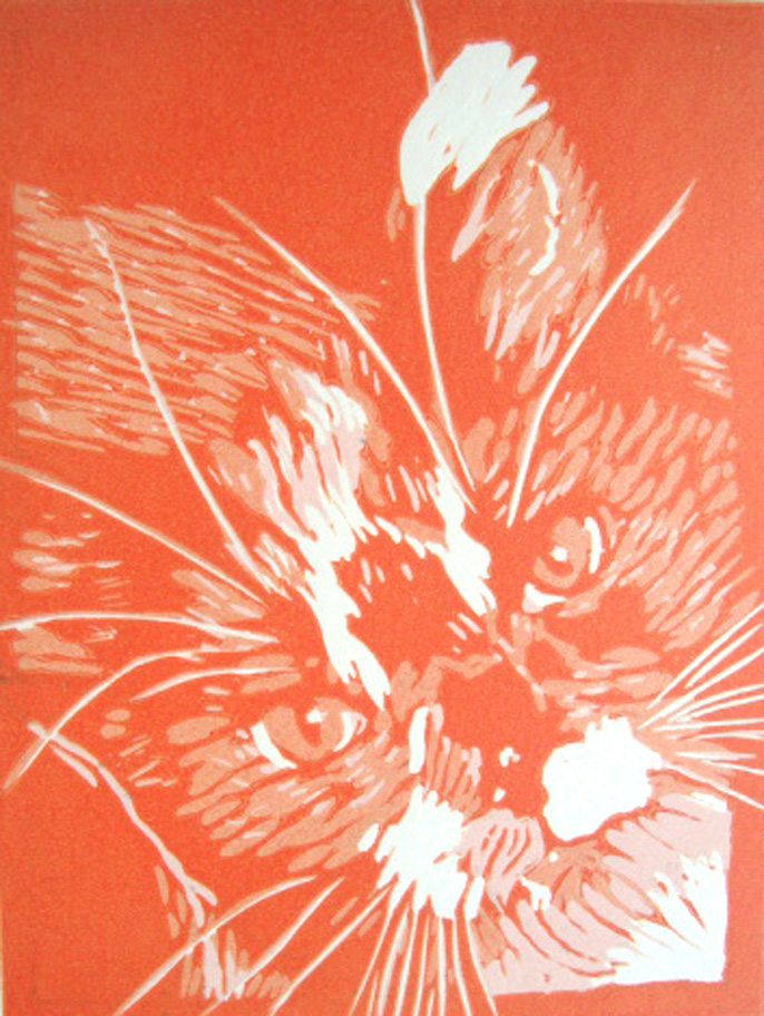 It’s Saturday #Caturday and here’s a blast from the past, a little reduction linocut of Sparta Puss when she was a kitten, dating from 2010. She’s looking a bit cross, as usual.