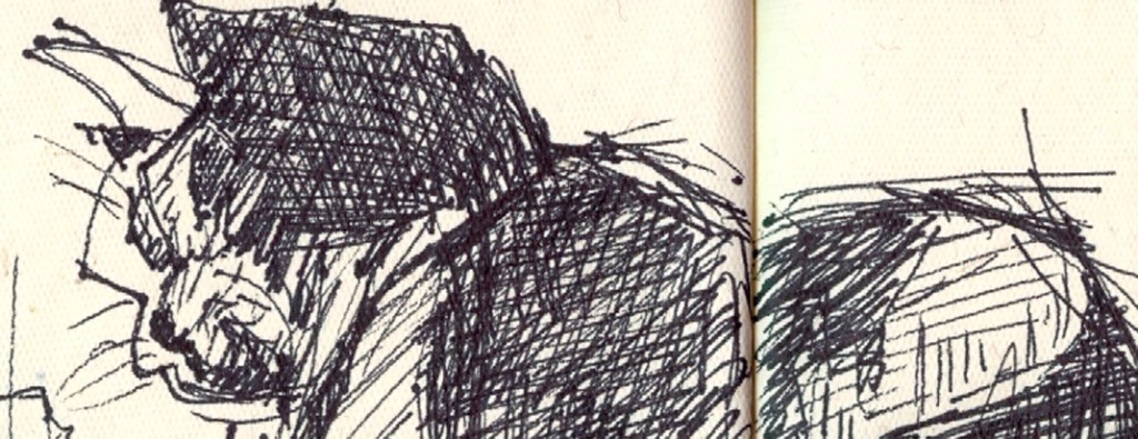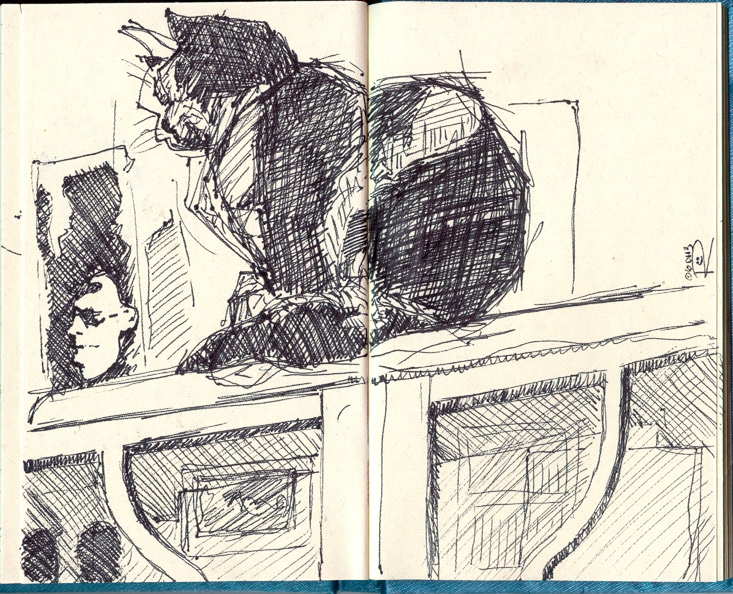 It’s #Caturday Saturday and here’s a blast from the past. Sparta Puss from 10 years ago, drawn in pen into a small sketchbook. She’s sitting on an old glass-fronted cabinet that Husb and I rescued from the street. There’s a cyanotype I did of Husb on her left.