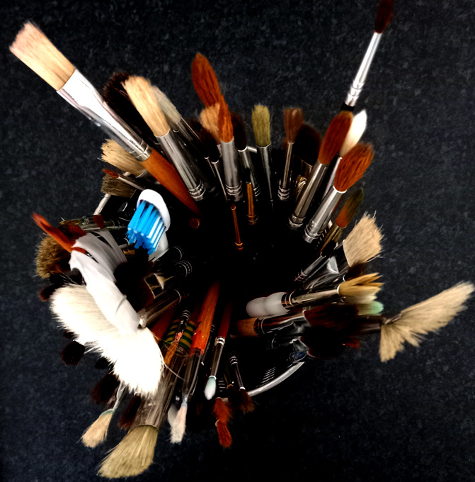 This blog has always been about my art practice but I don’t often post about the tools I use. And of course these underpin everything I do. Here’s a selection of brushes, some for watercolours and inks, some for acrylic paint. I don’t use oil paints. The toothbrush is for splatter and the feather – well I don’t know. It looks good in the pot 😀