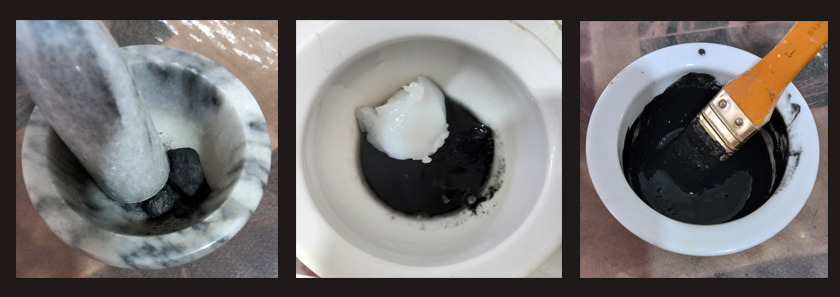 After coating some sheets of paper with my home-made walnut ink yesterday, I decided to stay with natural pigments and make paint with some lumps of Bideford Black I’ve had lurking in a box for years. I’d made paint with it before, using water (here). This time I mixed it with Nori paste and vodka. It was much thicker than the previous water-based one. I’m going to use it on top of the walnut ink paper.