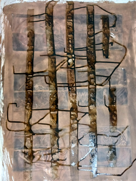 I had a little bit left of the Bideford Black paint I made recently. It wasn’t a lot so I tried thinning it down with water and took a fairly wide, flat brush to make stripes across one of the sheets of paper I’d prepared with gesso and walnut ink. The Bideford Black wash broke up on the surface of the paper in a very pleasing way. I tipped the paper to get the dribbles running across it.