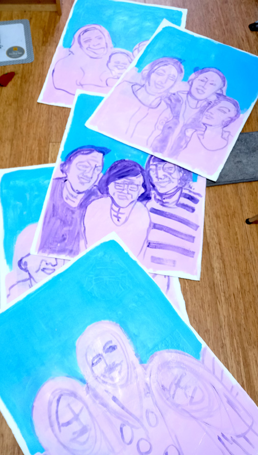 I carried on with my large paintings on paper, 5 at the same time. I worked on top of the pink foreground I’d blocked out with a Dioxazine Purple wash, sketching in faces and bodies of women and girls, in threes, triples. It’s a very basic starting point. I’m working entirely from my imagination, no reference to real life at all.