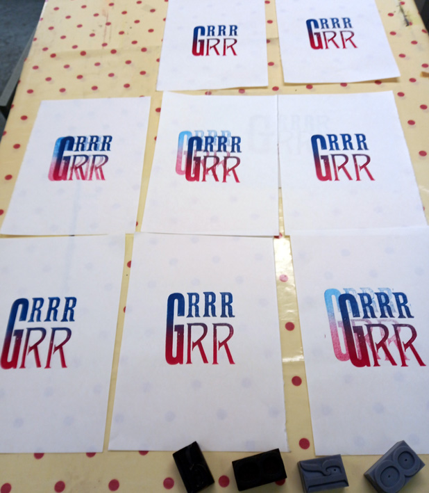 Here’s the little Type arrangement printed up. I’ve been trying out different ink / paper combos and I think this is the best one for me. The ink is Cranfield Safe-Wash Relief, in Process Cyan and Process Magenta with a dab of Extender in the middle. The paper is HoSho, printed on the smooth side on a Columbian press.