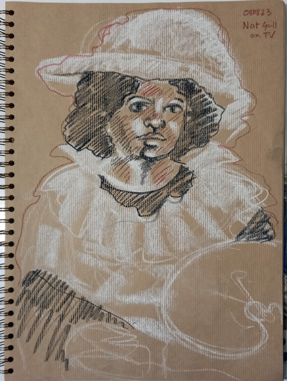 Another drawing from last night’s televised life drawing session from the National Gallery in London, drawn from my settee, I could happily do this more often. This model held a 14 minute pose and I drew with conte crayons in black, sanguine and white into a spiral bound, A3, brown paper sketchbook. Working onto a light brown background gave me an extra tone to work with.