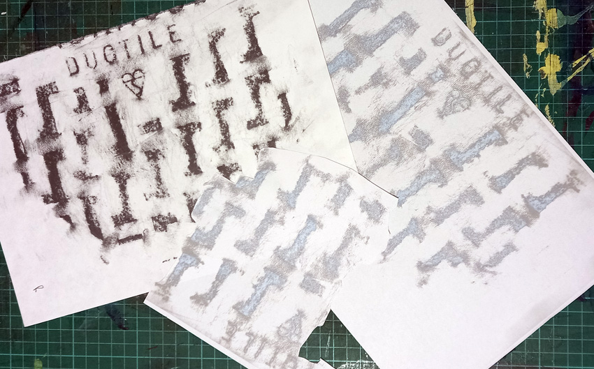When I got back, I photocopied some of the rubbings – the copier changed the colour from black/grey to shades of greyish blue and degraded the quality of the image a bit. I cut up some of these degraded images and played around with them on dark blue card.