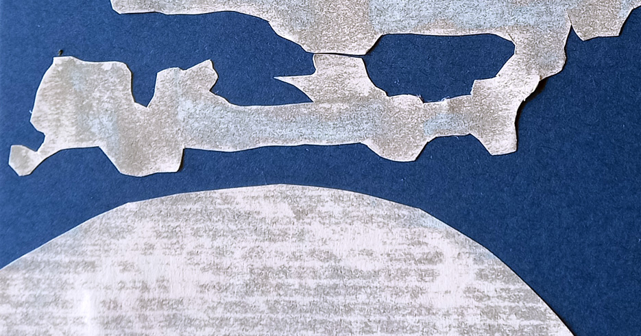 When I got back, I photocopied some of the rubbings – the copier changed the colour from black/grey to shades of greyish blue and degraded the quality of the image a bit. I cut up some of these degraded images and played around with them on dark blue card.