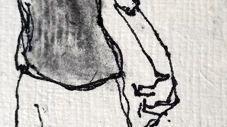 And another little scribble from last Friday’s gig at Elysium in Swansea. I was listening to King Goon and having a scribble at the same time, using a Faber Castell Pitt pen and Nitram charcoal. Although it’s been grey and rainy, it’s still very warm so lots of guys still in shorts, which I find really interesting to draw.